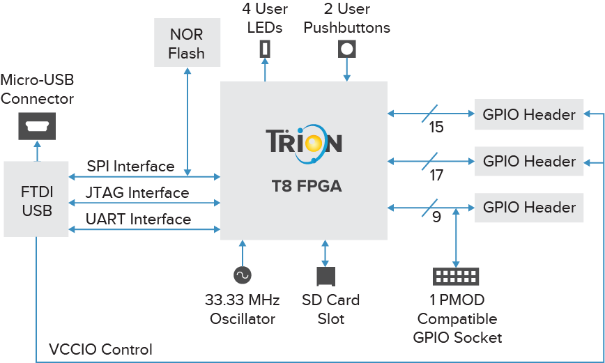 Отладочная плата Xyloni построена на базе ПЛИС Efinix® T8, имеющей 81-шариковый корпус FBGA. ПЛИС T8 имеют программируемую логику и структуру маршрутизации, построенную на технологии Efinix® Quantum™. Устройства T8 также включают встроенные блоки памяти, блоки умножения (или блоки DSP), PLL и генератор. Узнайте больше о Плис Trion